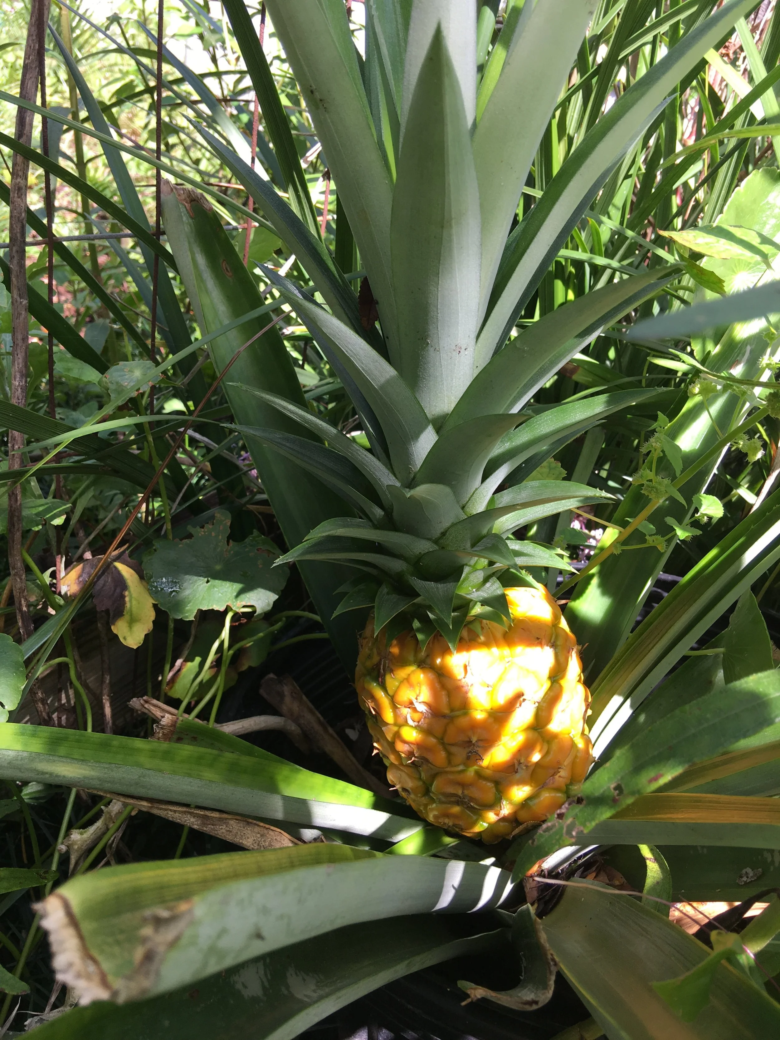 Another pineapple will soon be ready for harvesting! Three pineapples in one year. I’ve never had so many. All are in pots because pineapples are not very cold tolerant so they must be brought in during cold weather. It’s a pain but I lug them in and out. Every time I cut the top off a pineapple I put it in dirt and, Voila! a new pineapple plant begins. Just between you and me, I might have over-done it with the pineapples.